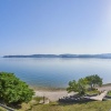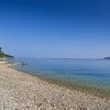 Plaža: postopoma padajoča prodnata, ponekod skalnata plaža, oddaljena 100-500m; 400m od nudistične plaže.