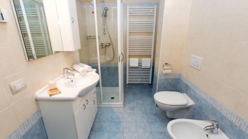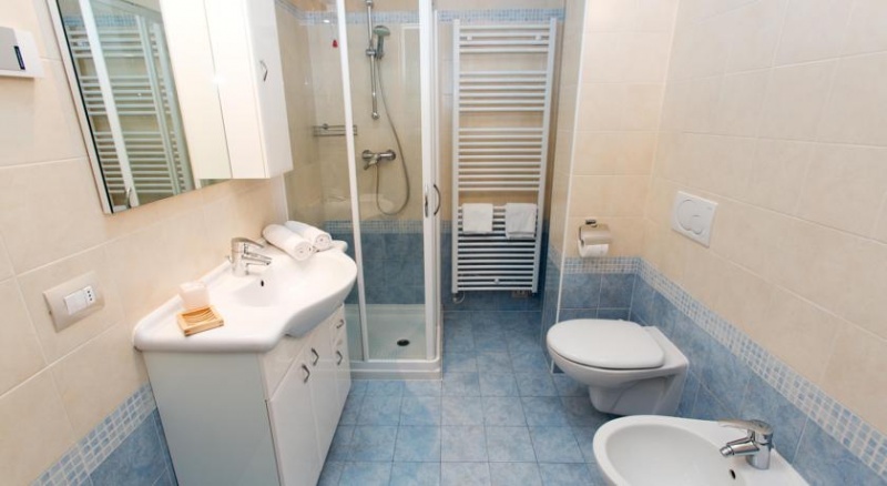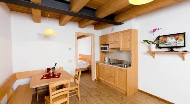 - 1/6 trisobni apartma: soba z zakonsko posteljo ali dvema ločenima ležiščema, niša v mansardi z dvema ločenima ležiščema, dnevni prostor s kuhinjo, jedilnim kotom in raztegljivo zakonsko posteljo, TWC. Nekateri apartmaji so mansardni.