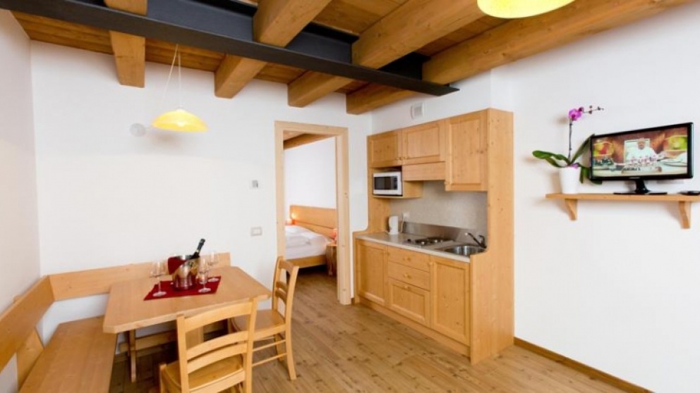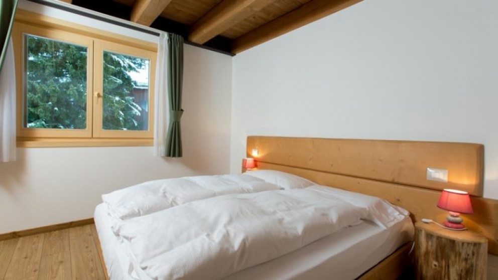 - 1/8 štirisobni apartma: soba z zakonsko posteljo ali dvema ločenima ležiščema, dve manjši sobi z dvema ločenima ležiščema, dnevni prostor s kuhinjo, jedilnim kotom in raztegljivo zakonsko posteljo, TWC, 2 balkona s pogledom na smučišče.